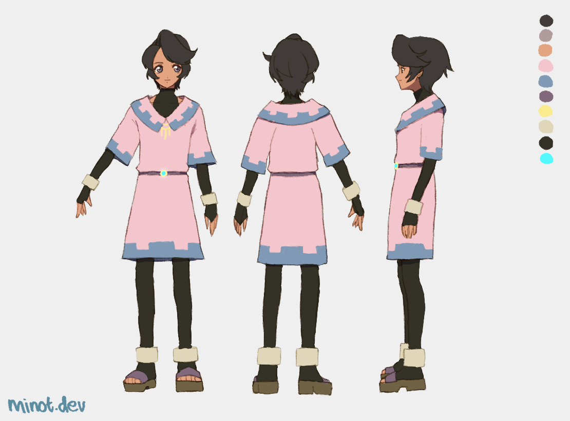 He wears a simple pastel pink tunic that is [almost] knee-length, with wide sleeves and blue geometric trim along the neckline, cuffs, and hem. The gold pattern below the neckline is actually part of the tunic, not an external accessory. Underneath, he wears a fitted black high-collar sleeveless undershirt (which actually reveals his belly), fingerless gloves, and leggings. There is a thin belt with a small circular ornament at the waist.